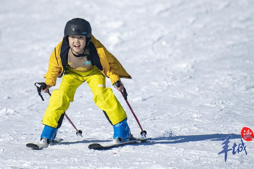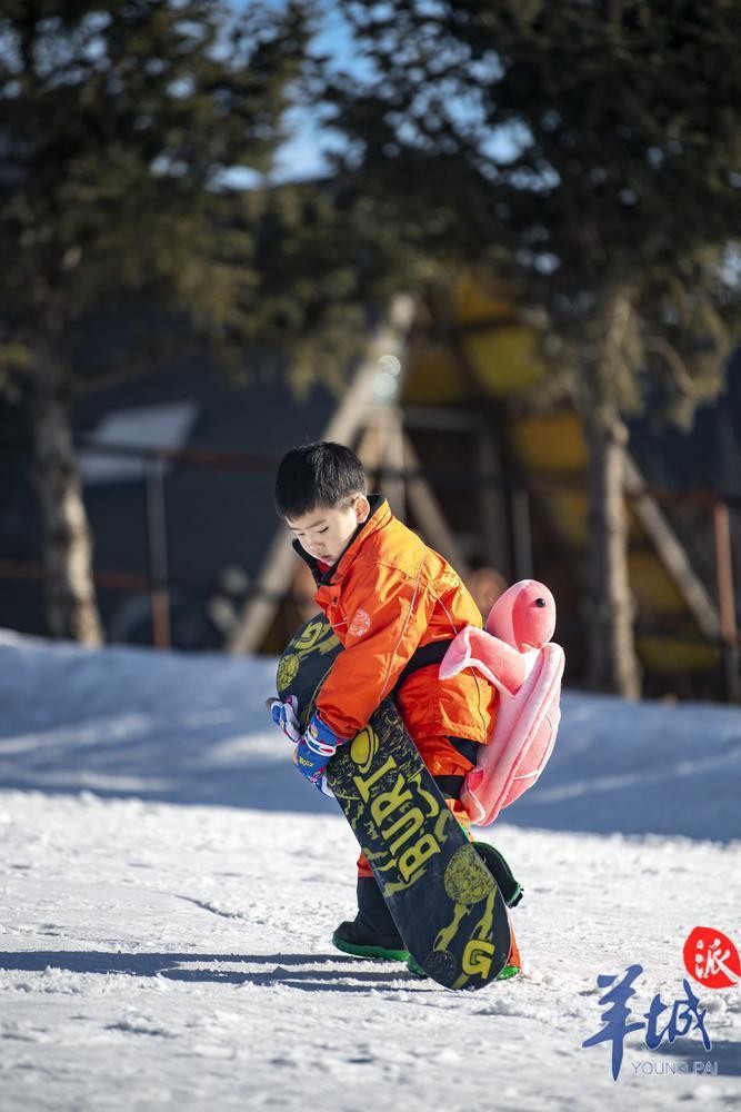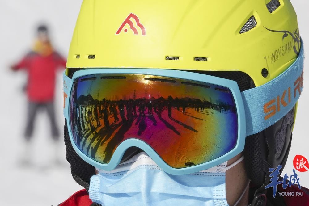 滑雪的游客穿戴着齐全的装备,各种防摔道具引入注目。(更多新闻资讯,请关注羊城派 pai.ycwb.com)