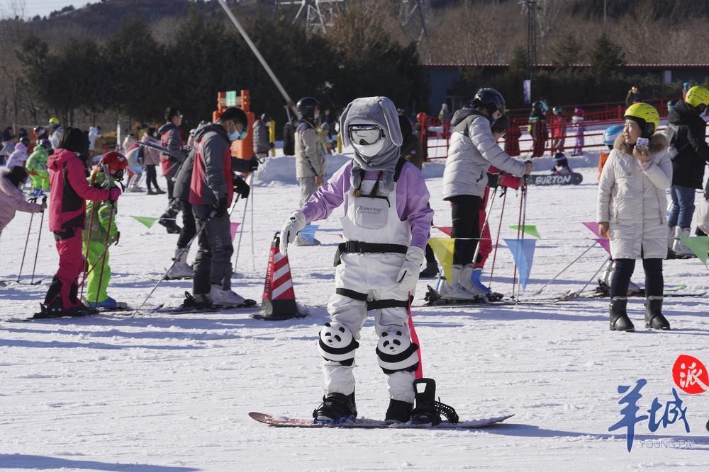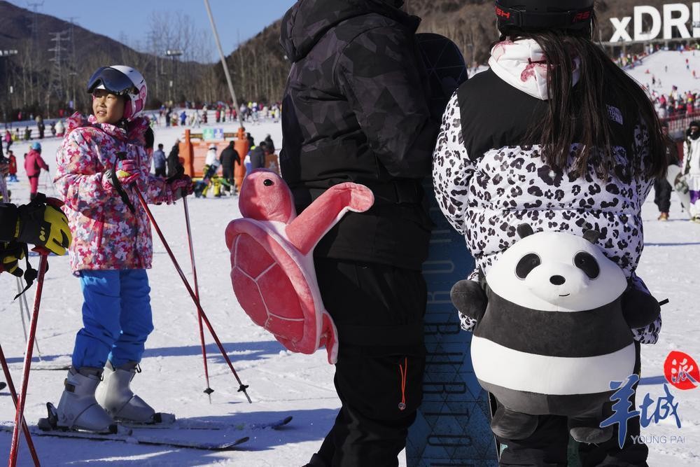 也有很一些零基础的游客在雪地上慢慢“摩擦”,保持不倒。大部分游客都做好了防护措施,有一些很可爱的防摔道具。南方人郝先生第一次在室外滑雪很兴奋,排了四五次上中级雪道,虽然偶然摔了跟头,但还是滑得很好,很开心很满足。