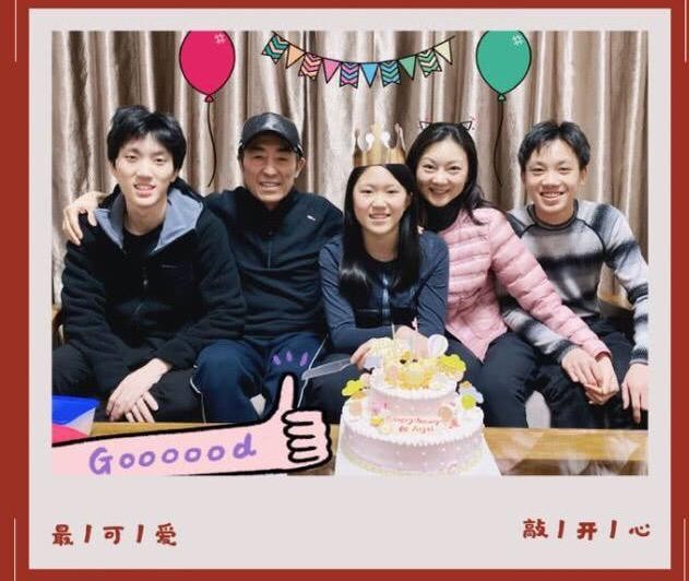 照片中的桌上仅有一个简单的蛋糕,服装也非常朴素。而娇妻陈婷和另外一个儿子不知为何并未参与合照。