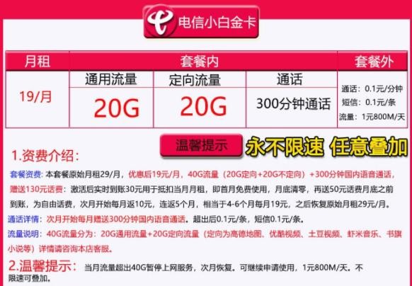 如图中所示,大家可以看到,这款名叫小白金卡套餐的月费为19元,它的亮点就在于套餐中不仅包含了20G的定向流量,而且还有20G的国内通用流量和每月300分钟的通话时长,不少网友感叹:“果然还是电信套餐最良心。”