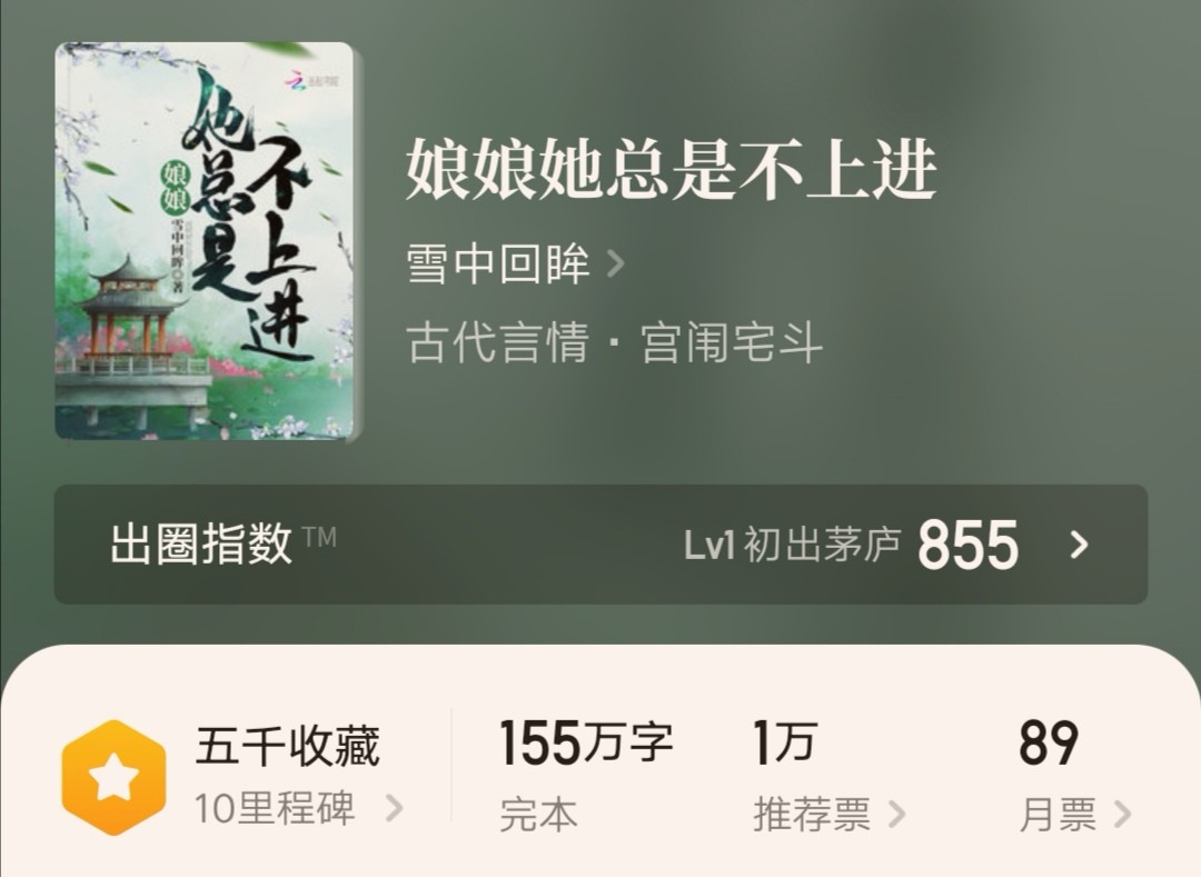 追完最新章,出于好奇,本人又去翻看了一下作者的其他作品,试读了《娘娘她总是不上进》等,也是不错的古言。