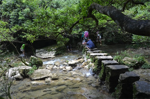 接下来都是野外的自然风景为主,在小溪间穿行,在瀑布下戏水,还有当地一个特有的植物和动物。喀斯特一般都会有溶洞,而我们去的那个溶洞是开放的初期,洞内有栈道,但没有灯光,门口每人发一个头灯,大家就靠这个去里面参观,空旷的地方,头灯的光都不够了,大家把光聚集在一起,才勉强能看看。四周漆黑一片,再往深入,安静得只有水滴滴下的声音,不敢再向前走了。在五眼桥,青龙涧,青龙瀑,青龙潭,青龙桥那一带风景秀美,山清水秀,非常适合徒步。当时的茂兰,游客稀少,到哪里都有一种野趣,一种非常好的旅行体验。