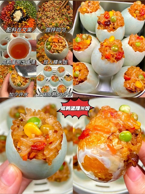 糯米泡水一晚上,加豌豆、胡萝卜碎、香菇丁、玉米粒、腊肠丁,一勺生抽、半勺老抽、一勺耗油、一勺油、少许胡椒根,搅拌均匀咸鸭蛋顶部去壳,倒出蛋清,把糯米饭装到咸鸭蛋里,9分满即可,加少许水放入蒸锅里,蒸50分钟即可