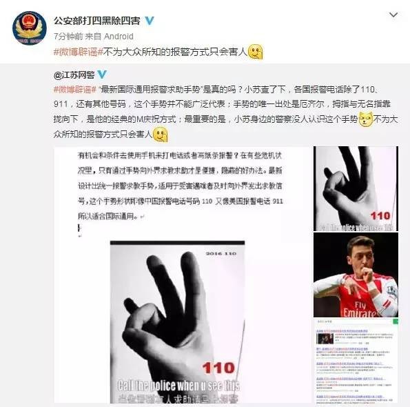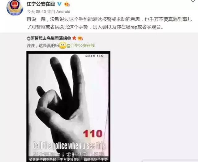 还有江苏的网友@江宁公安在线,江宁婆婆俏皮回复:没听说过这个手势能表达报警或求助的意思,也千万不要真遇到事儿了对警察或者民众比这个手势,别人会以为你在唱rap或者学观音。