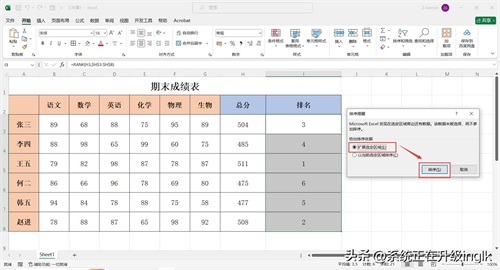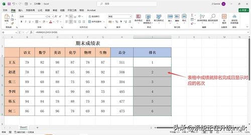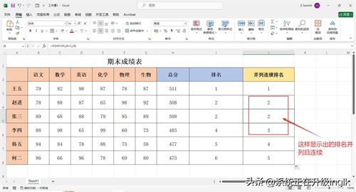 若需要排名的成绩有相同的数据(即存在并列成绩),按上述方法排名后会发现,并列成绩后空开了名次不连续(如图所示7),那么可继续下列操作: