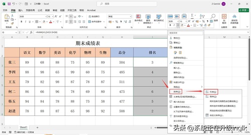 3、选中排名单元格区域,单击鼠标右键点击【排序】-【升序】,在弹出的“排序提醒”对话框中选择【扩展选定区域】,然后点击【排序】即可,这样表格中成绩就排名完成且显示对应的名次。