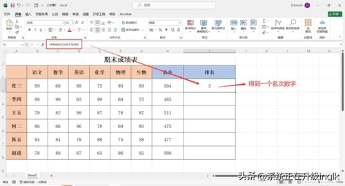 注:公式“=IF(H3>H4,J3+1,J3)”指,若第一个成绩“H3”大于第二个成绩“H4”,则名次就是第一个名次“J3”+1;否则就并列等于第一个名次“J3”。