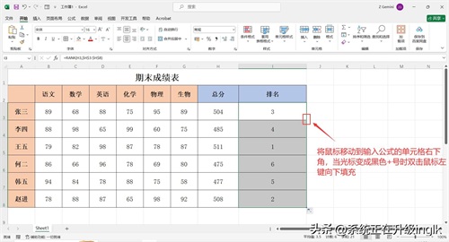2、将鼠标移动到输入rank公式的单元格右下角,当光标变成黑色+号时双击鼠标左键向下填充,所有名次即显示出来。