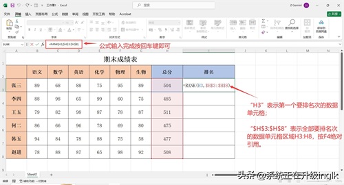 注:公式“=RANK(H3,$H$3:$H$8)”中,“H3”表示第一个要排名次的数据单元格,“$H$3:$H$8”表示全部要排名次的数据单元格区域H3:H8,按F4绝对引用。