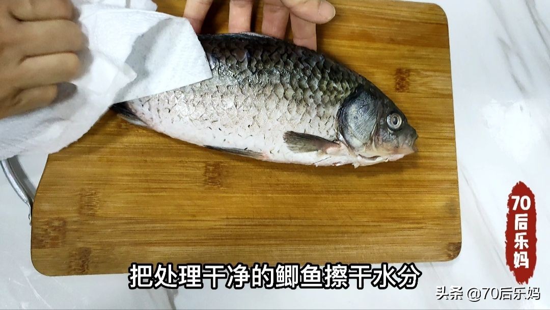 清洗干净的鲫鱼用厨房纸巾擦干水份。