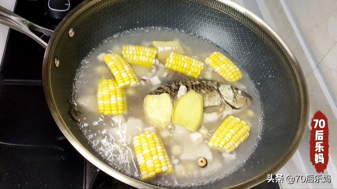 锅中放入少许食用油,油热放入鲫鱼,煎至两面微黄即可,倒掉多余油。接着把开锅状态的四神汤倒入鲫鱼锅中,放姜片去腥,玉米增色增香。